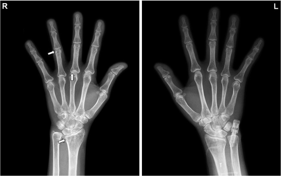 图1 常规x光片显示右手腕、第4指间关节近端和第3掌指关节侵蚀(白色箭头),手腕关节间隙变窄。