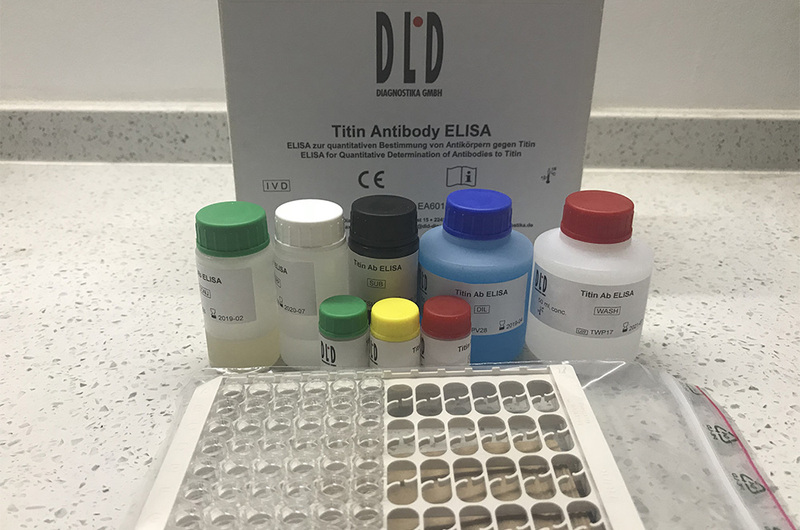 DLD肌联蛋白抗体ELISA检测试剂盒使用了重组的MGT30蛋白作为检测抗原,利用酶联免疫检测法(ELISA)可以特异地检测人血清或血浆中的肌联蛋白抗体。